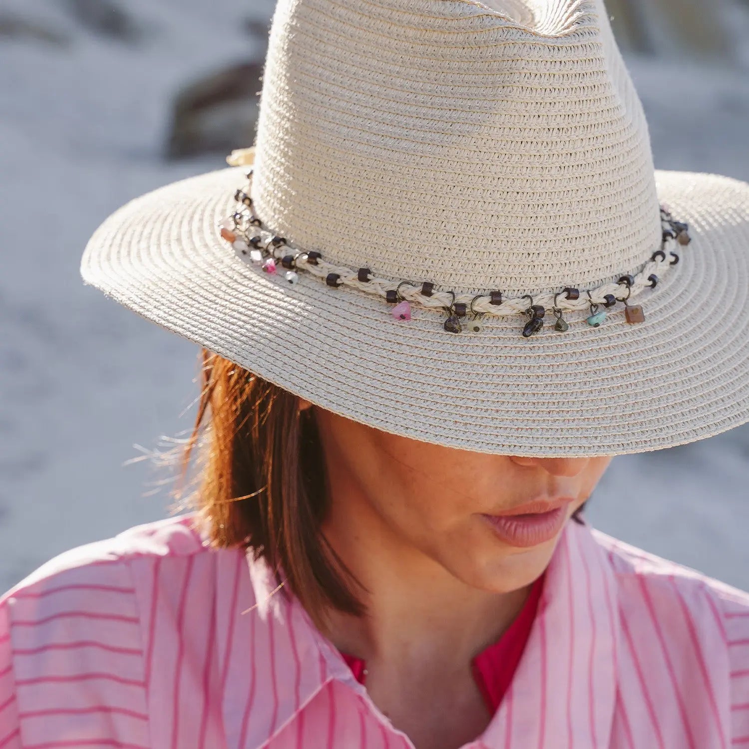 Le Emily Fedora est un chapeau de soleil d'été amusant pour femme disponible en blanc éclatant ou naturel, fini avec une bordure en corde de perles colorées autour de la couronne. Léger, respirant et conçu pour les journées ensoleillées.